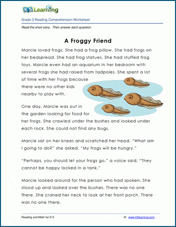 A Froggy Friend is a short fable for kids in grade 3; reading comprehension questions follow the story.