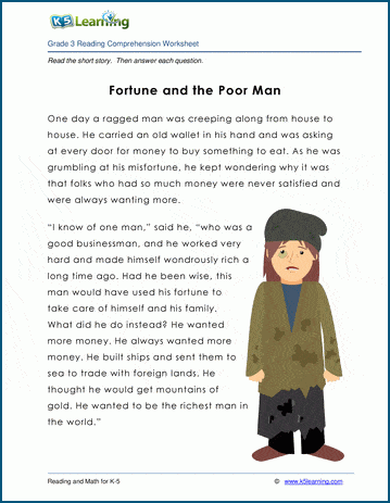Fortune and the Beggar is a fable for grade 3 students; the story is followed by reading comprehension questions.