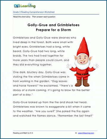 Golly Grue and Grimbletoes is a short fable for grade 3 students, followed by reading comprehension questions.