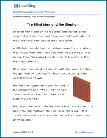 The Blind Men and the Elephant is a short fable for grade 3 students, followed by reading comprehension questions.