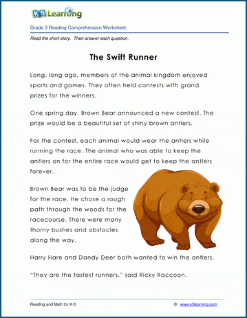 The Swift Runner is a short fable for grade 3 students, followed by reading comprehension questions.
