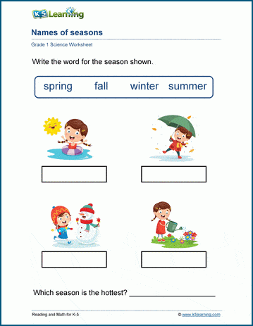 In these worksheets, students write the names of the seasons; each worksheet gets a little harder.