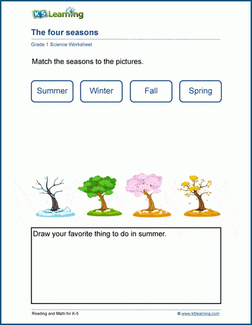 In these worksheets, students match the names of the seasons with pictures symbolic of that season. The first worksheet shows how a tree changes in the 4 seasons; the 2nd worksheet shows different seasonal activities.