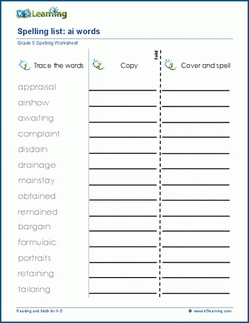 Students trace, copy and spell lists of spelling words containing the 2 letter blends ai, au, ch & fy. Example words: appraisal, audible, anchovy, identify.