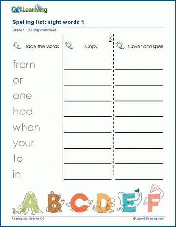 Sight words are words that students should recognize without needing to "sound them out". Spelling sight words helps with instant recognition. In these worksheets, students trace, copy and spell grade 1 sight words such as from, is, you, get, jar.
