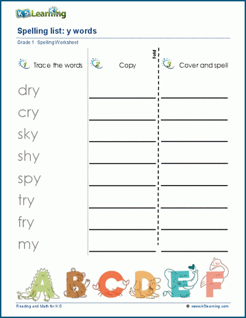 Students trace, copy and spell lists of spelling words containing the letter y, for example dry, cry, sky.