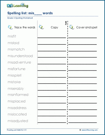 Students trace, copy and spell lists of spelling words with the prefixes mis, pre, re & un. Example words: misfit, prepack, rearrange, unzip.