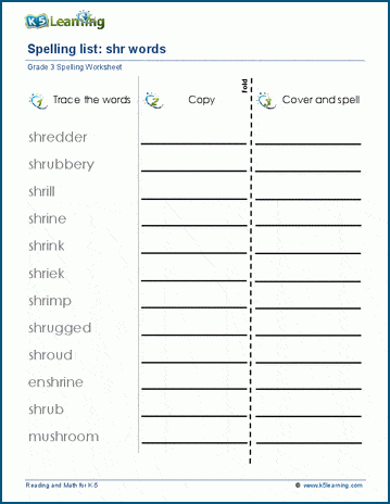 Students trace, copy and spell spelling words containing the 3 letter blends shr, squ, str, tch, & thr. Example words: shrill, squid, stroll, match, throw.