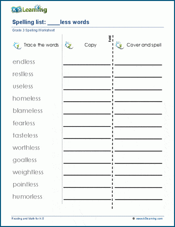 Students trace, copy and spell lists of spelling words ending with the suffixes less, ly, ness, sion & tion. Example words: endless, slowly, goodness, action.
