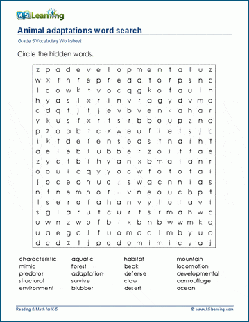 This word search has grade 5 vocabulary words related to animal adaptations. Answers may run in any direction, forwards or backwards.