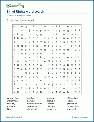 This word search has grade 5 vocabulary words related to the Bill of Rights. Answers may run in any direction, forwards or backwards.