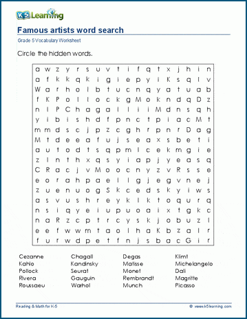 This word search has grade 5 vocabulary words related to famous artists. Answers may run in any direction, forwards or backwards.