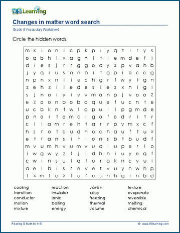 This word search has grade 5 vocabulary words related to changes in matter. Answers may run in any direction, forwards or backwards.