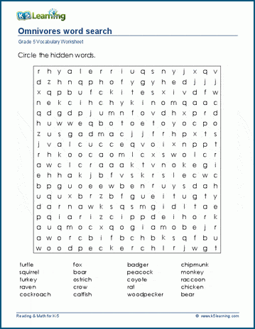 This word search has grade 5 vocabulary words related to omnivores. Answers may run in any direction, forwards or backwards.