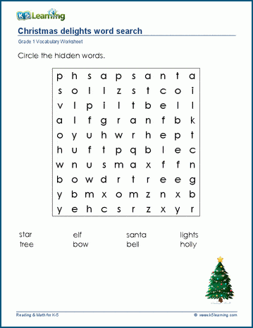 Worksheet #2This word search has grade 1 vocabulary words related to Christmas. All answers read horizontally to the right or downwards (no diagonal or backwards answers).