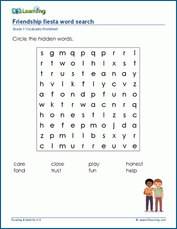 Worksheet #2This word search has grade 1 vocabulary words related to friendship. All answers read horizontally to the right or downwards (no diagonal or backwards answers).