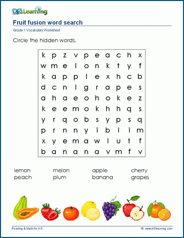 This word search has grade 1 vocabulary words related to fruit. All answers read horizontally to the right or downwards (no diagonal or backwards answers).