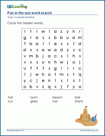 Worksheet #2This word search has grade 1 vocabulary words related to summer. All answers read horizontally to the right or downwards (no diagonal or backwards answers).