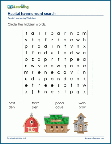 Worksheet #2This word search has grade 1 vocabulary words related to animal habitats. All answers read horizontally to the right or downwards (no diagonal or backwards answers).