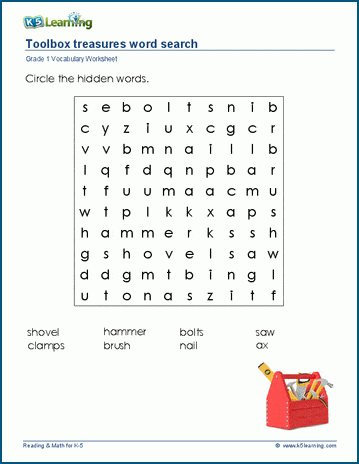 This word search has grade 1 vocabulary words related to tools. All answers read horizontally to the right or downwards (no diagonal or backwards answers).