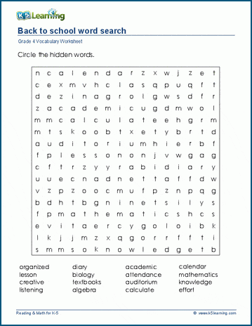 This word search has grade 4 vocabulary words related to going back to school. Answers may run in any direction.