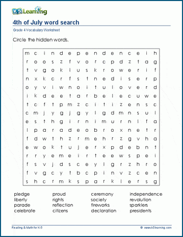 This word search has grade 4 vocabulary words related to Independence Day. Answers may run in any direction.