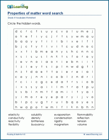 This word search has grade 4 vocabulary words related to the properties of matter. Answers may run in any direction.