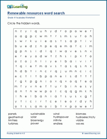 This word search has grade 4 vocabulary words related to renewable resources. Answers may run in any direction.
