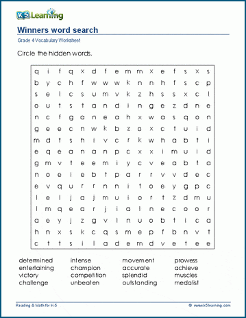 This word search has grade 4 vocabulary words related to winning in sports. Answers may run in any direction.