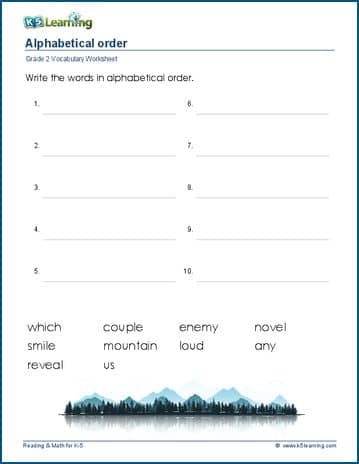 Learning to put words in alphabetical order has practical applications as we use this order to index systems, such as bus or train timetables and dictionaries. In these worksheets, students list 10 words in alphabetical order.