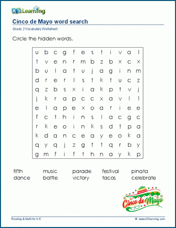 This word search has grade 2 vocabulary words related to Cinco de Mayo. Answers may read horizontally, vertically or diagonally; however, there are no backwards answers.