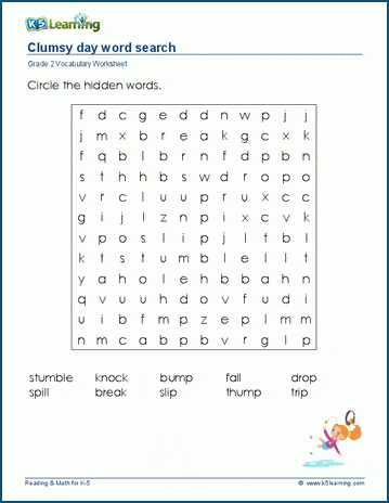 This word search has grade 2 vocabulary words related to clumsiness. Answers may read horizontally, vertically or diagonally; however, there are no backwards answers.